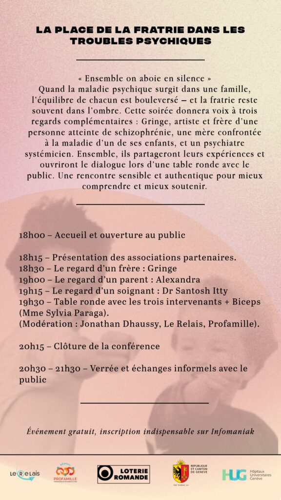 Quand la maladie psychique surgit dans une famille, l’équilibre de chacun est bouleversé – et la fratrie reste souvent dans l’ombre. Cette soirée permettra trois approches complémentaires : Gringe, artiste et frère d’une personne atteinte de schizophrénie, une mère confrontée à la maladie d’un de ses enfants, et un psychiatre systémicien. Ensemble, ils partageront leurs expériences et ouvriront le dialogue lors d’une table ronde avec le public. Une rencontre sensible et authentique pour mieux comprendre et mieux soutenir.
