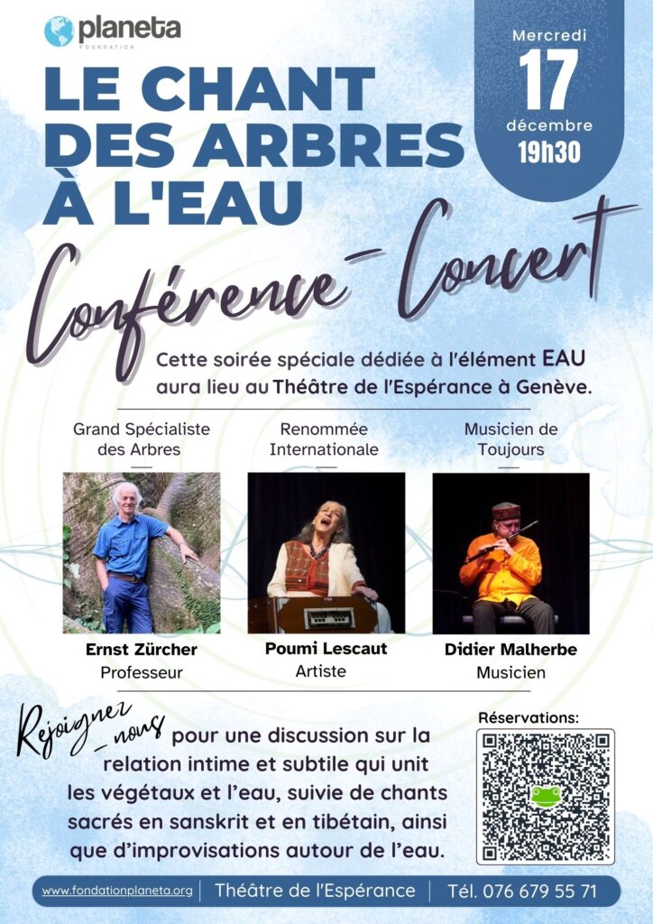 La Fondation Planeta a l’immense plaisir de vous convier à un événement autant original qu’exceptionnel : une conférence-concert intitulée « Le Chant des Arbres à l’Eau » avec le Professeur Ernst Zürcher et l’artiste Poumi Lescaut. Cette soirée spéciale dédiée à l’élément eau aura lieu le mercredi 17 décembre 2025 à 19h30 au Théâtre de l’Espérance à Genève.