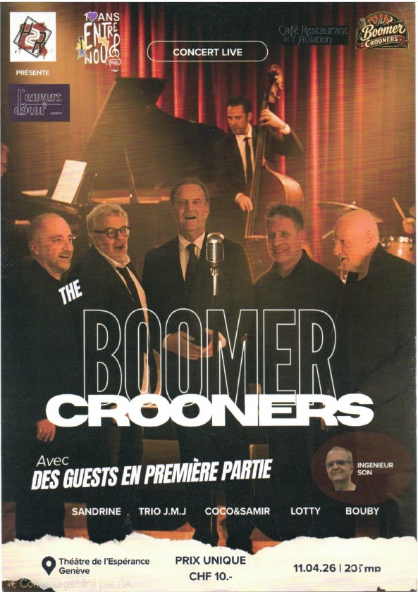 The Boomer Crooners, cinq artistes genevois d’exception, vous offrent un concert unique, porté par l’élégance, la maturité et la passion de toute une vie dédiée à la musique. De Jacques Brel à Charles Aznavour, de Frank Sinatra à Louis Armstrong, redécouvrez les plus grandes œuvres du répertoire français et international, sublimées par cinq voix habitées et authentiques.